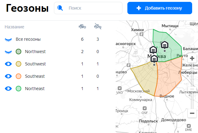 Скрывать и отображать геозоны на карте можно с помощью значков