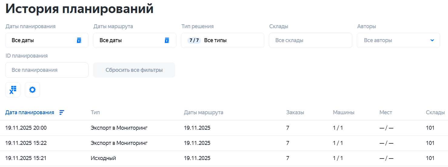 Если вы несколько раз запускаете одну и ту же задачу планирования, Маршрутизация не обрабатывает данные повторно, а обращается к полученному ранее решению. Поэтому в истории отображается только одна строка.