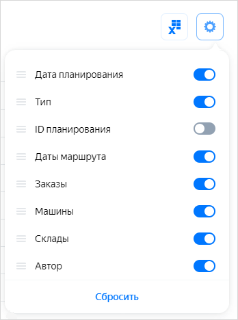 Столбец ID планирования по умолчанию скрыт, его можно включить в настройках вида таблицы. Порядок столбцов можно изменить перетаскиванием.