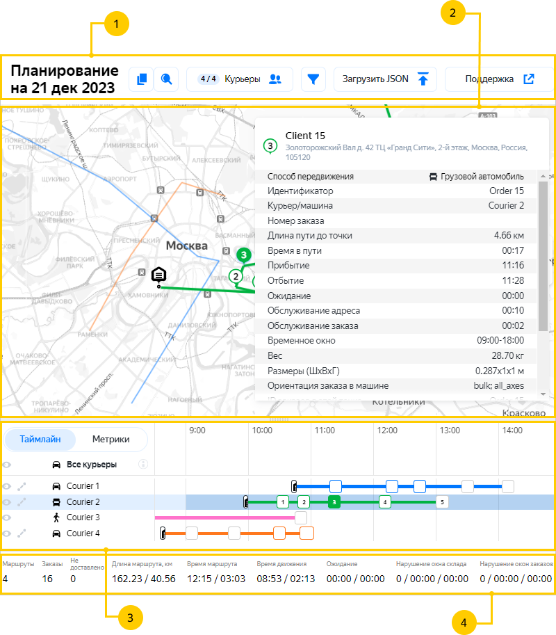 - Карта — географическое представление построенных маршрутов и нераспределенных заказов.
