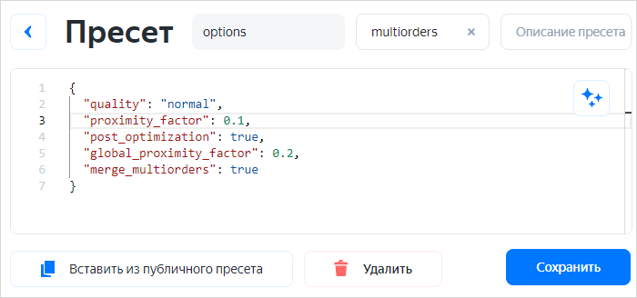 Пресет — это предварительно подготовленный набор настроек, который сохранен в формате JSON и может быть включен в запрос API.