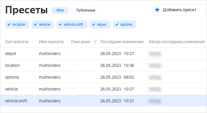 Редактировать можно только собственные пресеты, доступные вашей компании. Для каждого пресета хранится только последняя (текущая) версия.