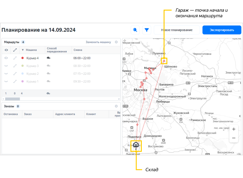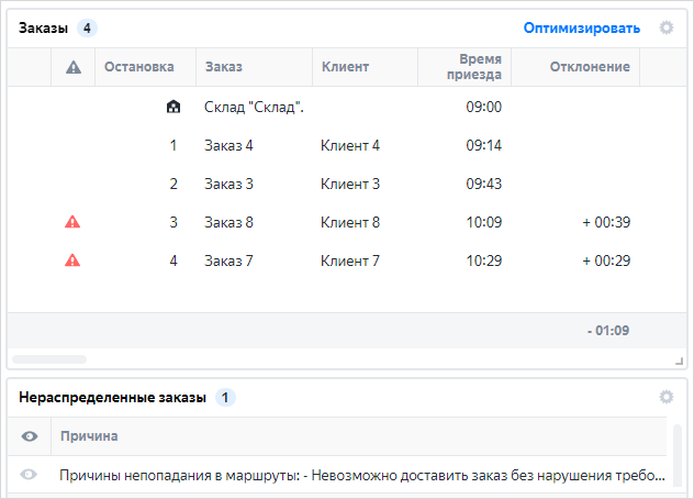 Заказы и Нераспределенные заказы — заказы, которые входят в выбранный маршрут и которые не удалось включить в маршруты соответственно.