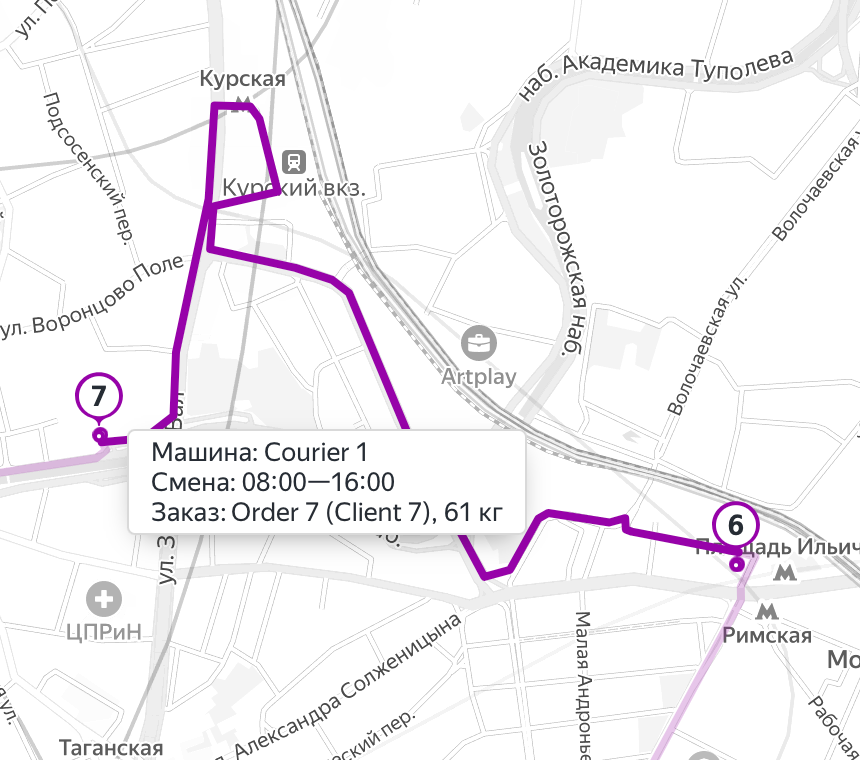При наведении указателя на маршрут на карте появится всплывающая подсказка с информацией о машине и свойствах заказа: загруженности по весу, объему и вместимости (грузовым единицам).