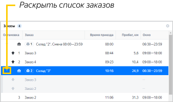Чтобы посмотреть список заказов, которые забираются со склада или доставляются на него, нажмите на стрелку. Количество заказов указано на значке рядом с названием склада.