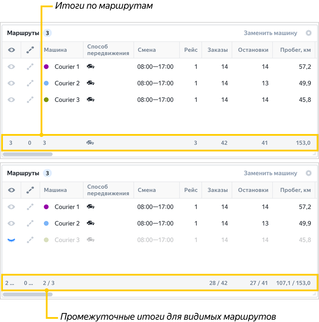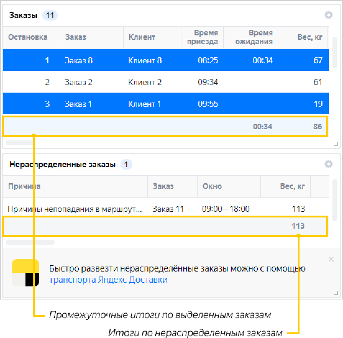 Итоговые данные по маршрутам и заказам отображаются в таблицах в строке итогов.