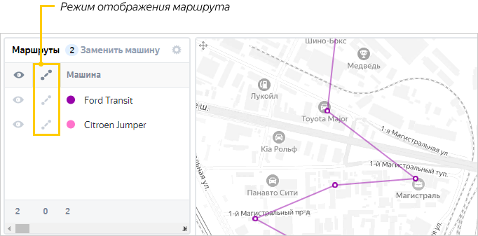 — значок переключает отображение маршрута: схематично прямыми линиями или по дорогам. Чтобы подключить эту возможность, обратитесь в техподдержку.