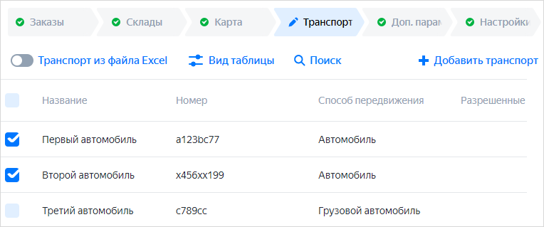 После заполнения справочника транспортных средств необязательно передавать лист Vehicles в файле Excel. При планировании на вкладке Транспорт вы можете выбрать, использовать данные из файла Excel или справочника. В любой момент вы можете переключаться между этими режимами.