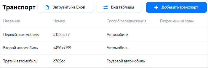 Для автомобилей вы можете задать ограничения по зонам доставки. Укажите зоны, из которых автомобилям разрешено и запрещено доставлять заказы. Добавлять разрешенные и запрещенные геозоны можно только при редактировании уже созданного транспортного средства.