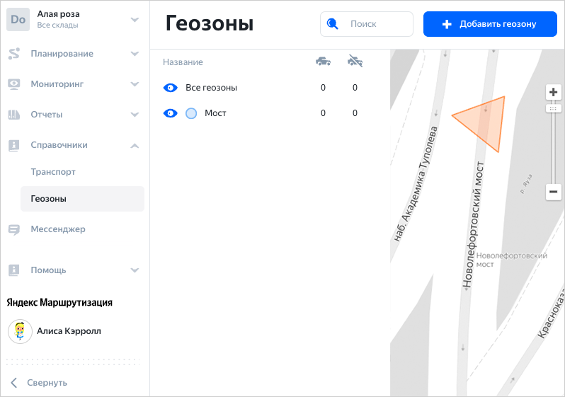Например, чтобы запретить движение по мосту, не нужно выделять территорию всего моста. Достаточно добавить геозону треугольной формы на въезд.