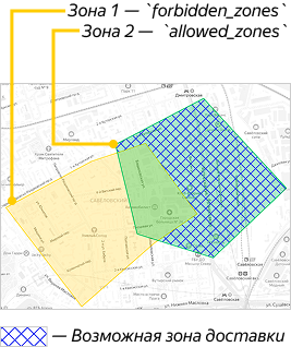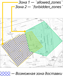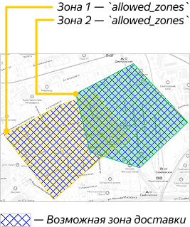 Если заказ расположен в области пересечения зон, то возможно несколько сценариев доставки. При этом значения в поле Запрещенные геозоны (vehicle.forbidden_zones) имеют более высокий приоритет, чем в поле Разрешенные геозоны (vehicle.allowed_zones).