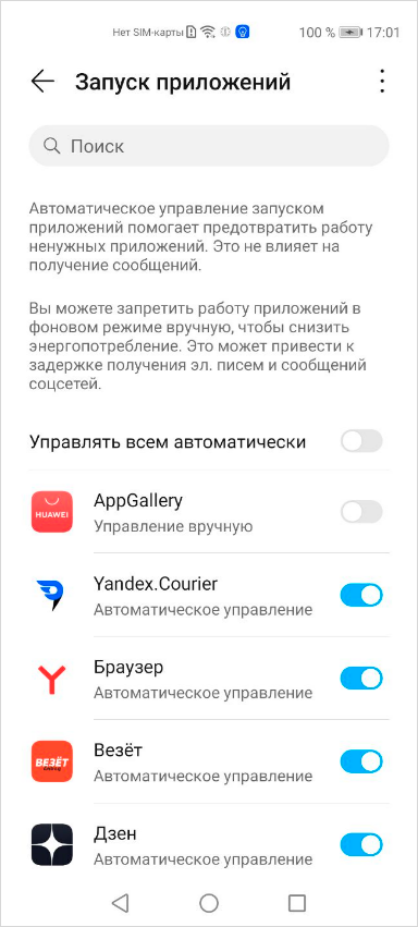 Найдите в списке Yandex Courier и отключите опцию. В появившемся окне Управление вручную оставьте все переключатели включенными. Нажмите ОК.