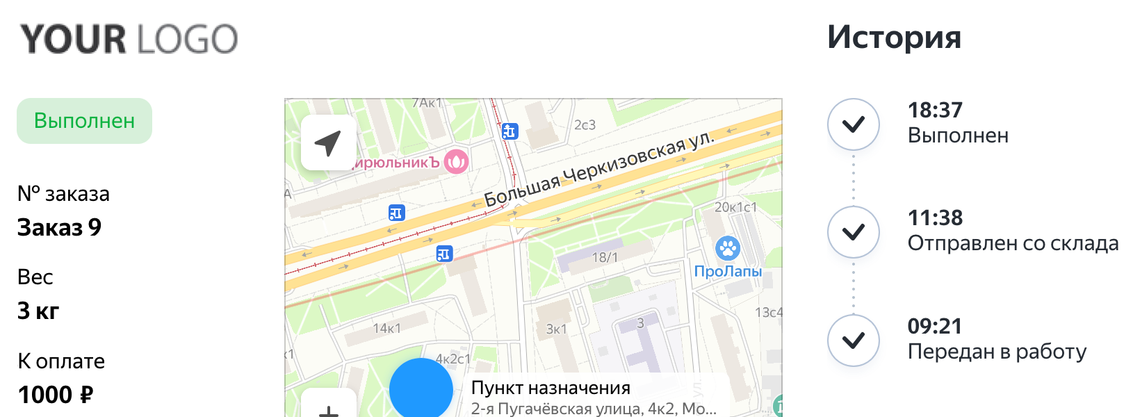 Если включена настройка отображения геопозиции, на виджете отобразятся трек и текущее местоположение курьера.