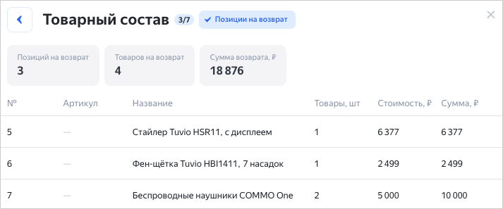 Нажмите Позиции на возврат, чтобы исключить из таблицы доставленные позиции. Вы увидите: