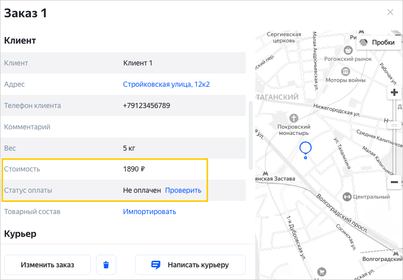 В разделе Клиент — поля Стоимость и Статус оплаты. Чтобы посмотреть текущий статус оплаты, нажмите Проверить.