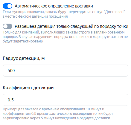 Укажите Коэффициент детекции — это отношение времени, которое должен провести курьер в радиусе детекции, чтобы заказ автоматически считался выполненным, к суммарному времени обслуживания на заказ и на адрес.