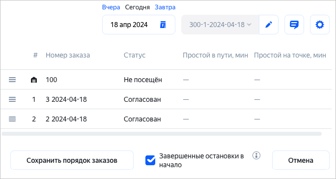 Если требуется, дополнительно вручную измените порядок заказов — удерживая строку мышью, переместите ее на нужную позицию в маршруте.