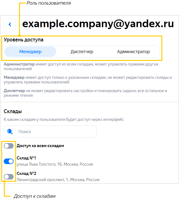 Если вы назначаете роль Менеджер или Диспетчер, укажите, к каким складам и компаниям предоставить доступ пользователю.