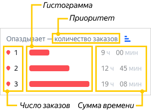 Для статусов Опаздывает, Доставлен раньше и Доставлен позже укажите приоритет: Общее время или Количество заказов. От выбора приоритета зависит, по какому значению строится гистограмма.