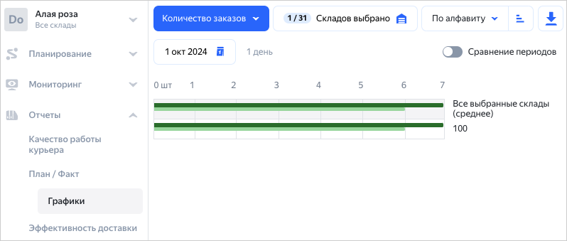 Для построения графика используются те же данные, что и в предыдущем примере: за вчерашний день курьер должен был доставить 7 заказов. Указывается, что на графике нужно отразить заказы, привязанные к складу с номером 100. В результате видно, что курьер смог доставить только 6 заказов из 7.
