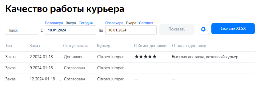 Оценки и отзывы по заказам можно посмотреть в отчете Качество работы курьера и выгрузить в Excel.
