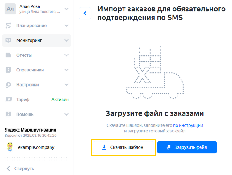 Для загрузки заказов с подтверждением доставки через SMS используйте файл Excel, заполненный по шаблону. Шаблон можно также скачать через интерфейс Рабочего места логиста. Для этого: