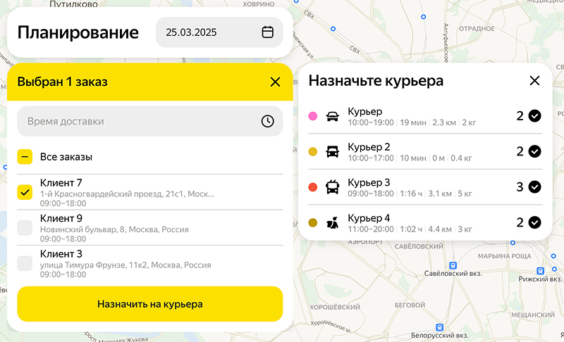 Автоматическое планирование распределяет заказы между курьерами и формирует маршруты с учетом следующих факторов:
