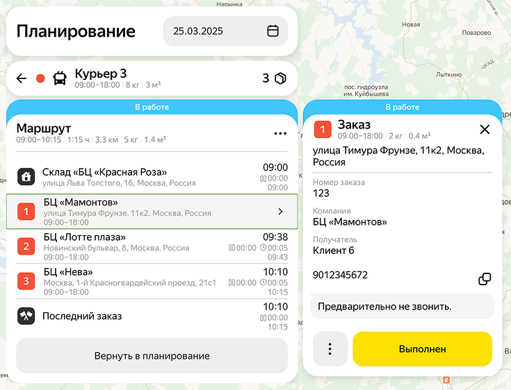 Также статусы Выполнен и Не выполнен поступают из приложения Яндекс Маршрутизация.