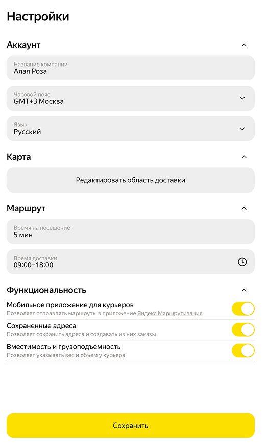 мобильное приложение для курьеров — вы можете разрешить отправлять маршруты в приложение Яндекс Маршрутизация.