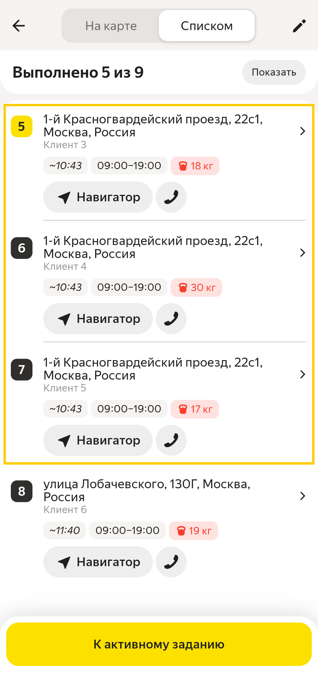 20. Кнопка Навигатор, чтобы построить маршрут до заказа в Яндекс Навигаторе, Яндекс Картах или внутренней системе навигации.