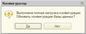 После окончания загрузки расширения нужно обновить конфигурацию базы данных, нажав Да и подтвердить список изменений в следующем окне.