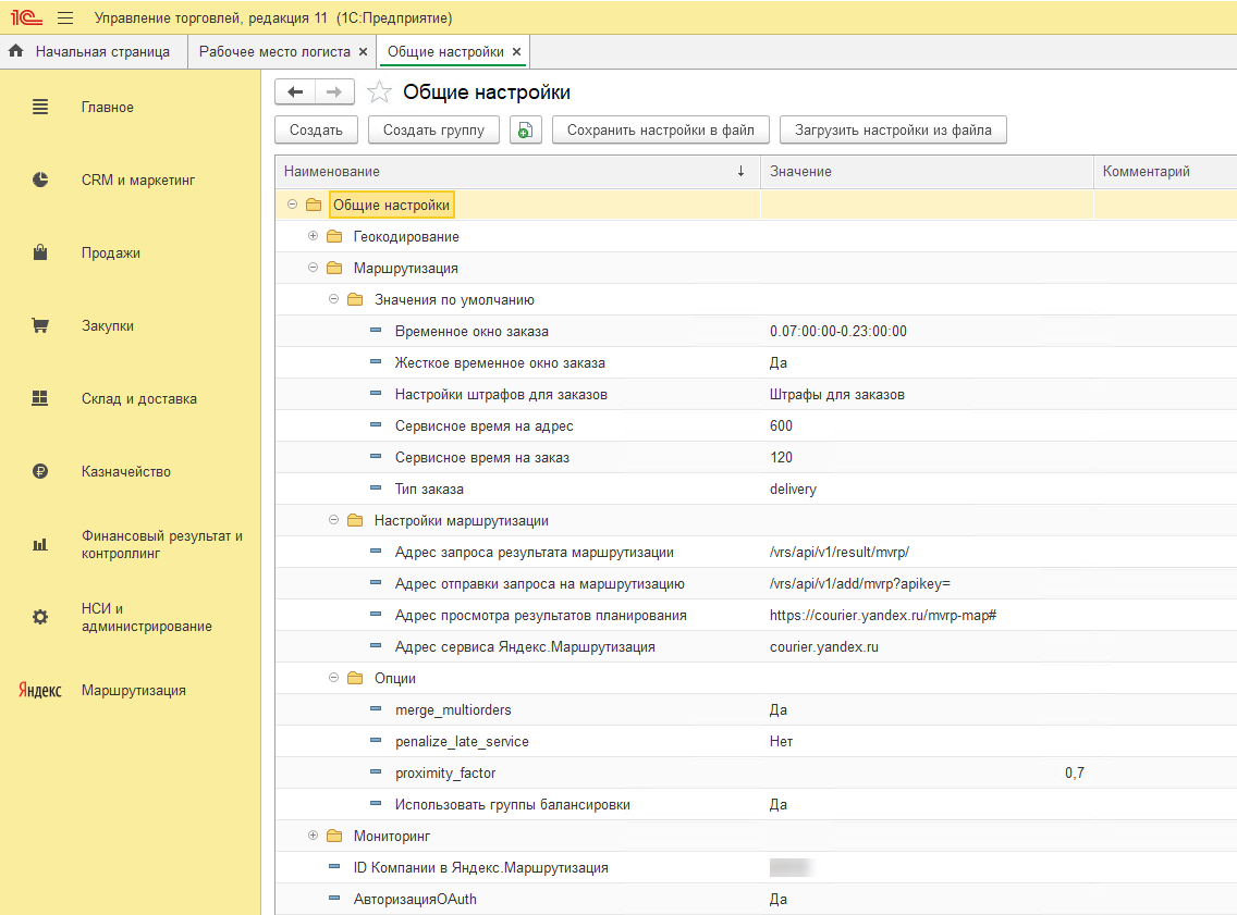 Для формирования запроса в сервис Яндекс Маршрутизация требуется ввести необходимые настройки модуля и заполнить справочники Склады отгрузки и Машины.