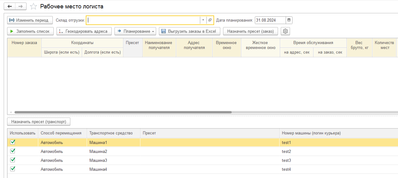 использования пресетов для настройки склада, заказа, курьера или автомобиля, глобальных опций;
