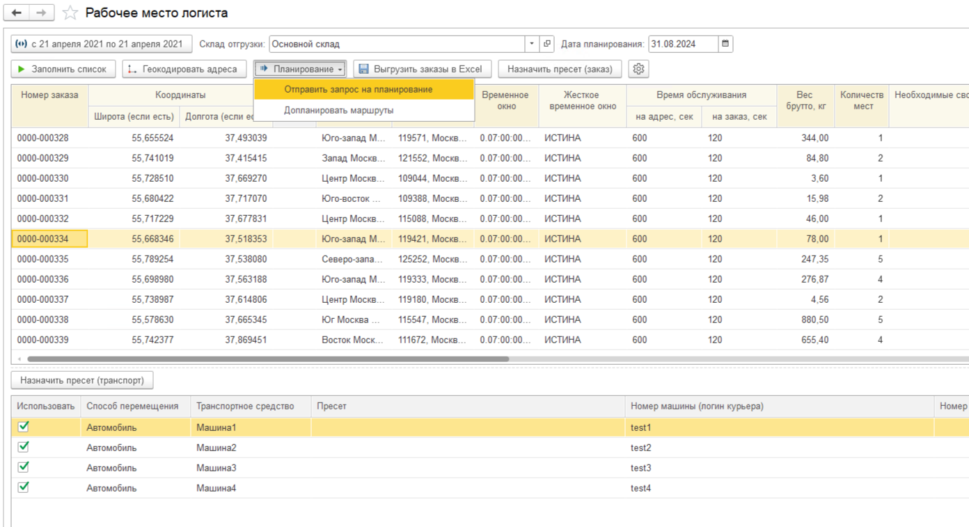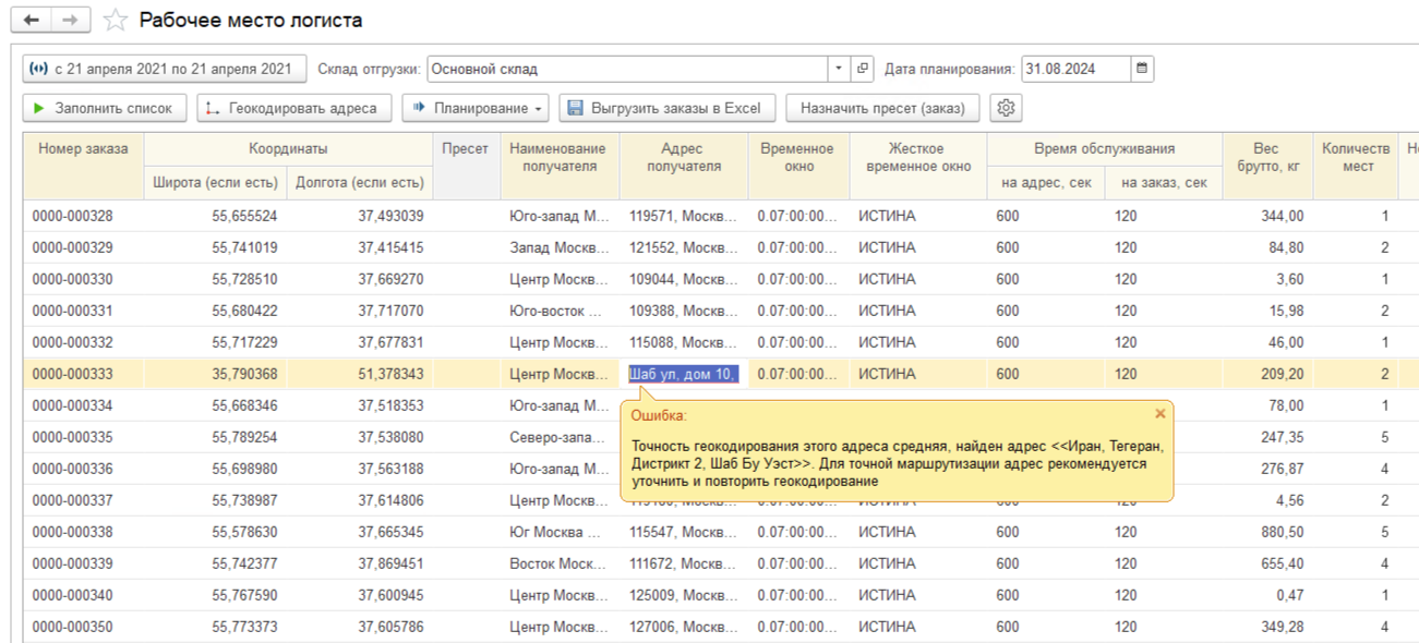 Координаты для заказов можно заполнить в списке вручную. Если нужно геокодировать адреса, нажмите кнопку Геокодировать. Для этого в настройках должен быть указан API-ключ сервиса Яндекс Геокодирование.
