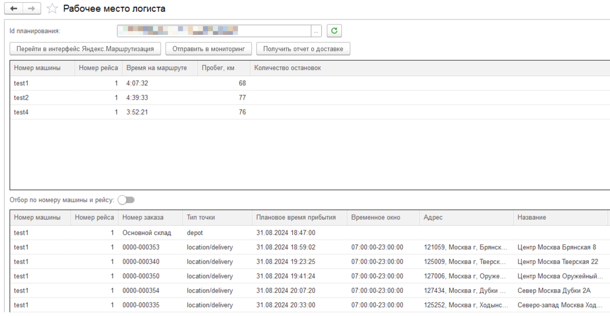 Для просмотра результатов перейдите на вкладку Результат планирования. По умолчанию отображается последний оправленный запрос. Чтобы найти запрос, в поле id планирования укажите