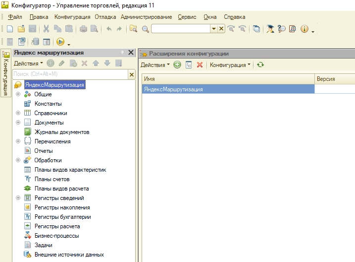 После этого расширение будет загружено в конфигурацию. В режиме предприятия на Панели разделов появится новый пункт Яндекс Маршрутизация.