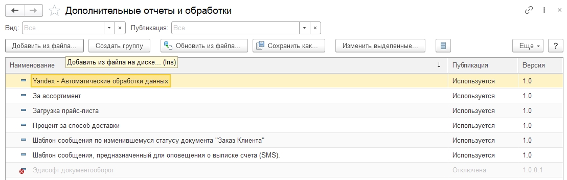 Обработка с заданной периодичностью запрашивает у сервиса обновление статусов для запросов на маршрутизацию в статусах, отличных от Завершен и Ошибка. Сделать это можно открыв справочник Дополнительные отчеты и обработки, нажав на его форме кнопку Добавить из файла и выбрав файл обработки на диске: