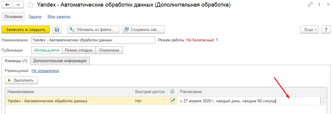 Для добавленной обработки можно будет настроить расписание запуска, выбрав его в строке таблицы на форме.