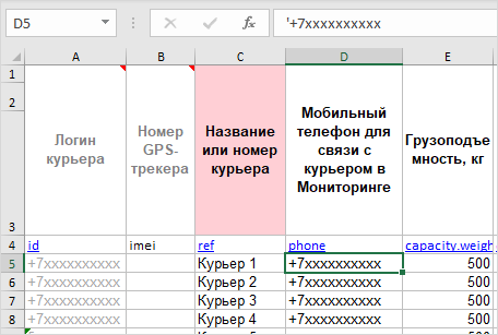 - через Excel — в полях Логин курьера и Телефон укажите номер телефона курьера.