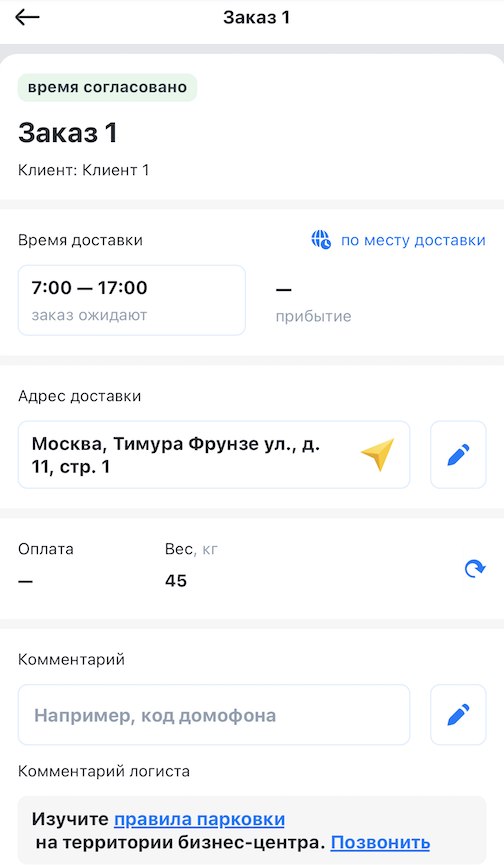 address— адрес заказа. Отобразится в интерфейсе планирования, если поле заполнено. Обязательно для заполнения, если координаты заказа не указаны; -