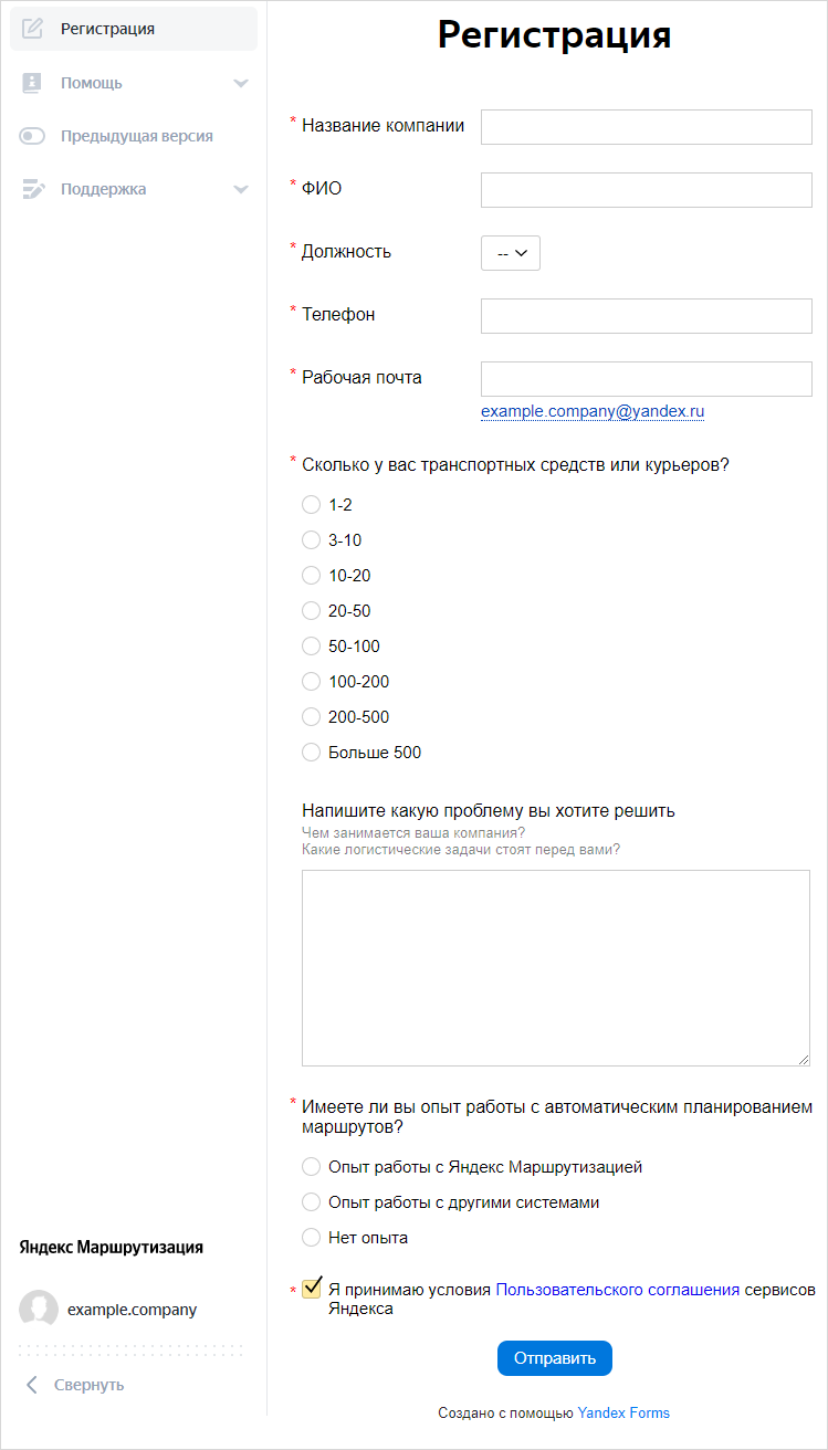 Чтобы получить возможность планировать маршруты в Яндекс Маршрутизации, необходимо зарегистрировать компанию в сервисе.
