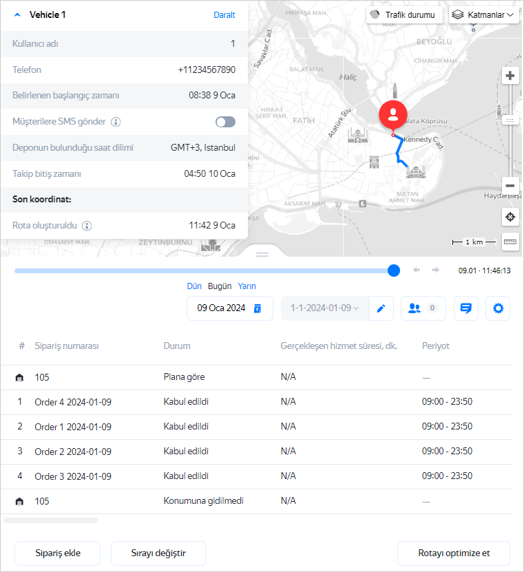 Rota tamamlanmış veya en azından başlamışsa, haritanın altındaki mavi kaydırıcı aktif hale gelir. Kaydırıcıyı hareket ettirerek kuryenin zamanla değişen konumlarını takip edebilirsiniz. Kaydırıcının sağında ilgili saat notları gösterilir. Kuryenin istediğiniz bir saatte konumunu görüntülemek için Haritada göster'e tıklayın.