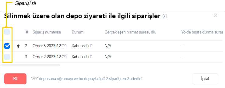 Ara depoya uğrama silindiğinde bu uğramaya bağlı olan siparişleri de silinmesi önerilir. İşaretleri kaldırarak siparişlerin bir kısmını silebilir, bir kısmını da bırakabilirsiniz (kalan siparişlerin bu rotada mutlaka olması gerektiğinden emin olmanız halinde).
