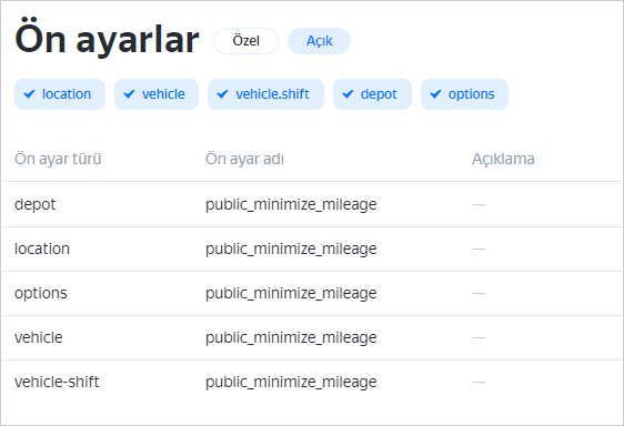 depot– depo ayarları,location– sipariş ayarları,vehicle– kurye veya araç ayarları,vehicle-shift– kurye değiştirme ayarları,options– küresel seçenekler.