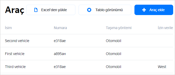 Web arayüzünde araçları dizine manuel olarak teker teker ekleyebilirsiniz. Çok sayıda araca ilişkin verileri aynı anda girmek için Excel dosyalarını kullanın.