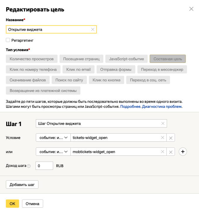 событие: идентификатор цели содержит tickets-widget_open ИЛИ событие: идентификатор цели содержит mobtickets-widget_open