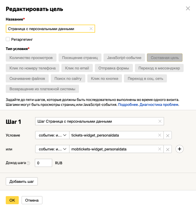 событие: идентификатор цели содержит tickets-widget_personaldata ИЛИ событие: идентификатор цели содержит mobtickets-widget_personaldata