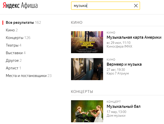 Егер қайда бару керектігін білмесеңіз, Яндекс.Афиша сізге іздеу жолағының көмегімен оқиғаны таңдауға көмектеседі. Қаладағы танымал шараларды көру үшін іздеу жолын басыңыз немесе шараның тақырыбын енгізіңіз, мысалы «қазақ», «музыка». Сыбырсөздер тізімі пайда болады.