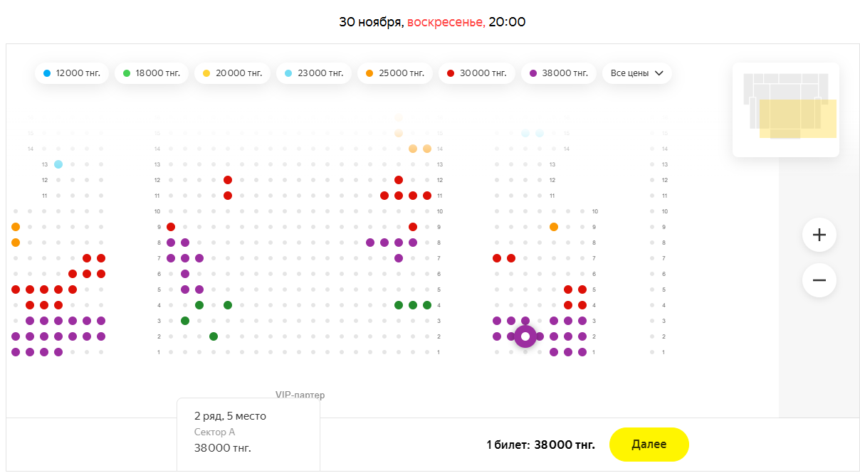 - Выберите места на плане зала. Внизу отобразится стоимость билетов.