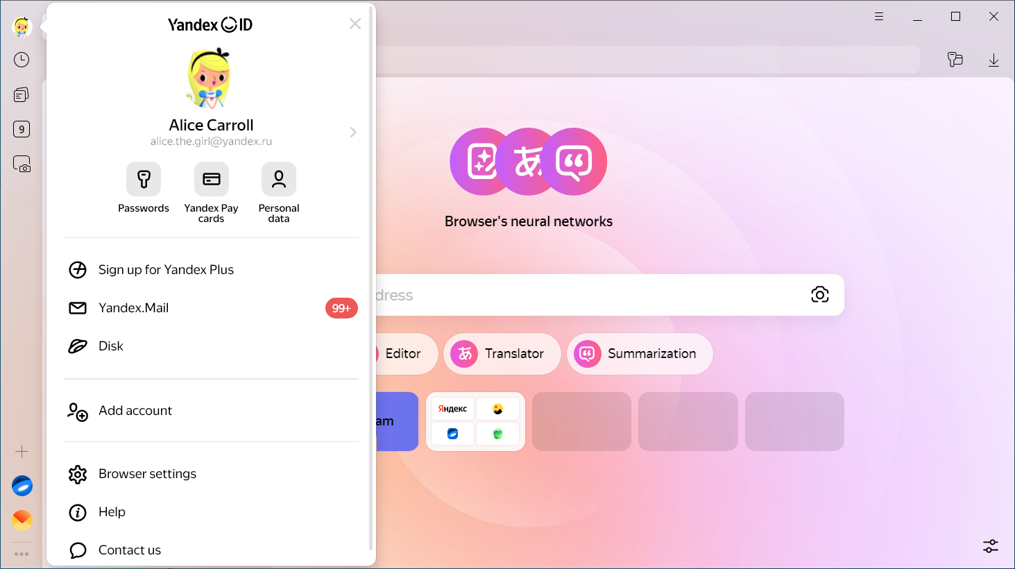 Logging in gives you quick access to your personal data (such as passwords and cards), Yandex services, and frequently used Yandex Browser features.